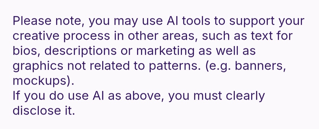 Their policy only explicitly mentions being able to use AI for text used in marketing, or images not relating to the pattern (like shop banners). It’s probably safest for people to just avoid using AI at all in product photos (especially with the Ribblr community’s general dislike of images with any hint of AI to them).