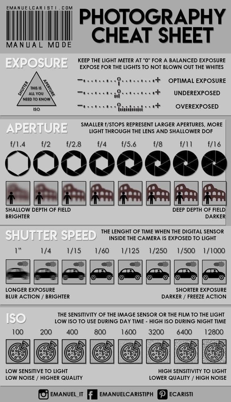 4 most important things in the camera: ISO, F-stop, exposure, Shutter Speed.