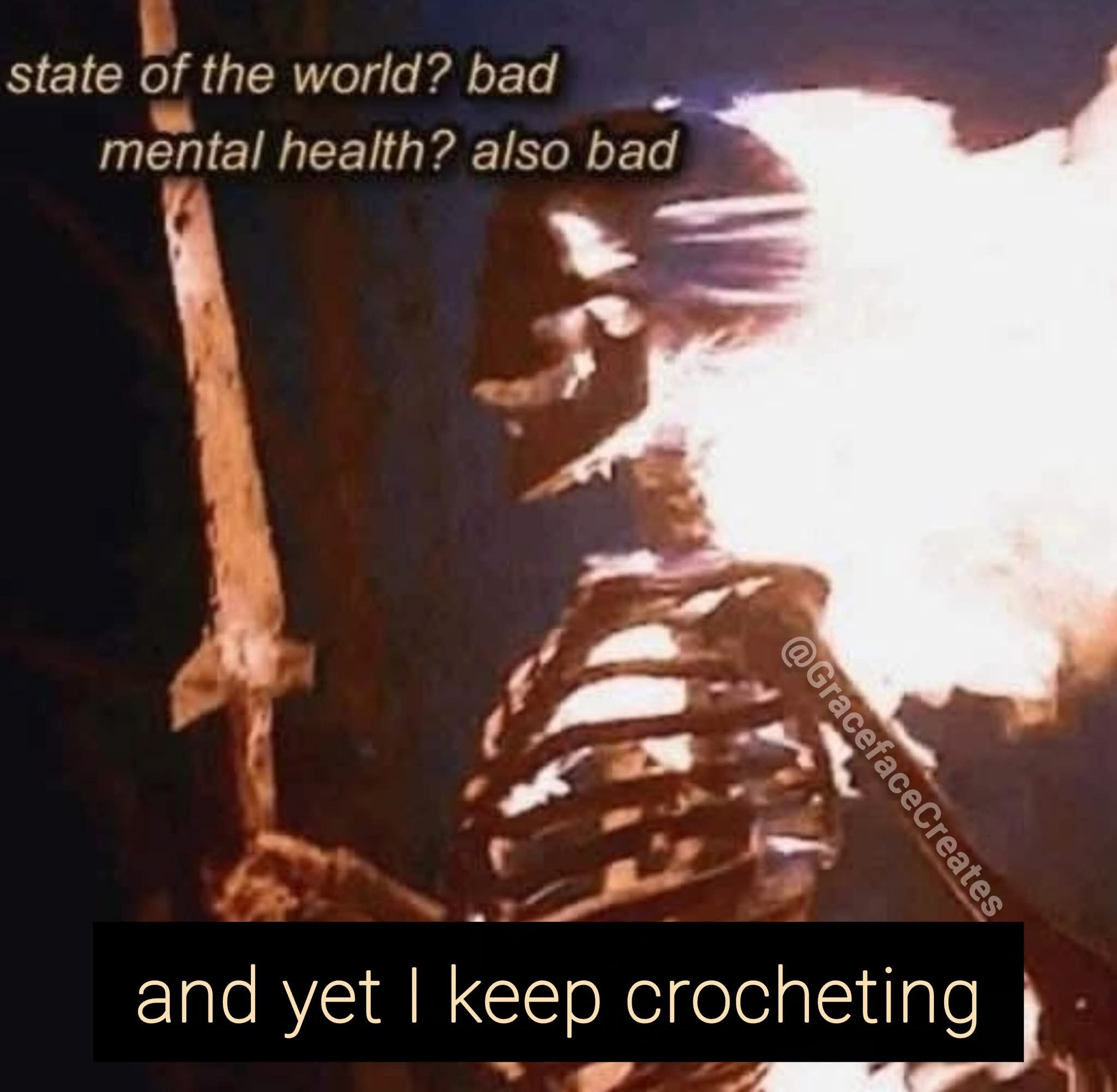I remember watching a lady use these exact words to explain crocheting, it wasn’t even Halloween yet. I crocheted for so long and such way to decribe it never came to me, what a unique thought. Usually it’s: insert hook, yarn over, pull the loop. ![]()