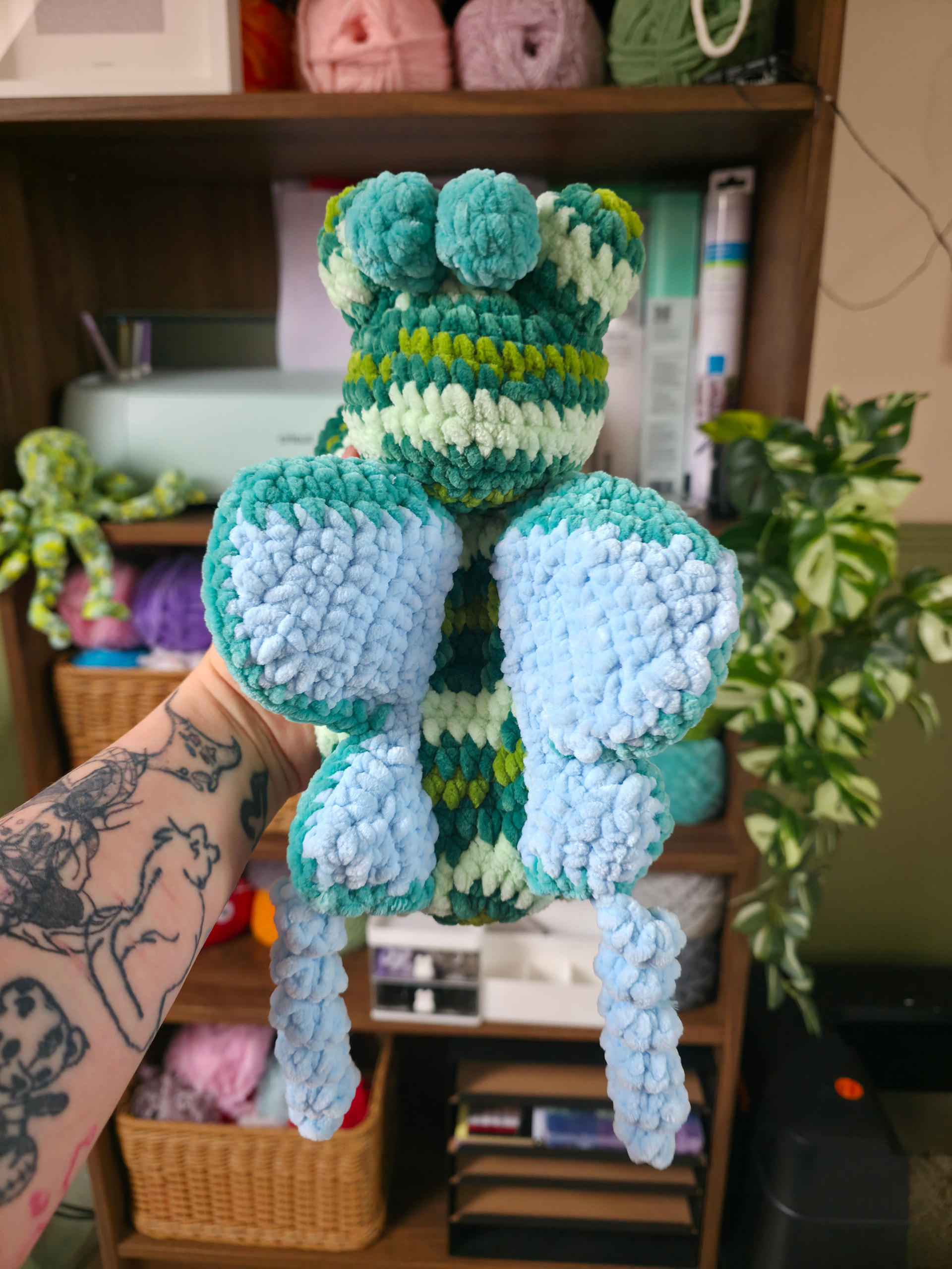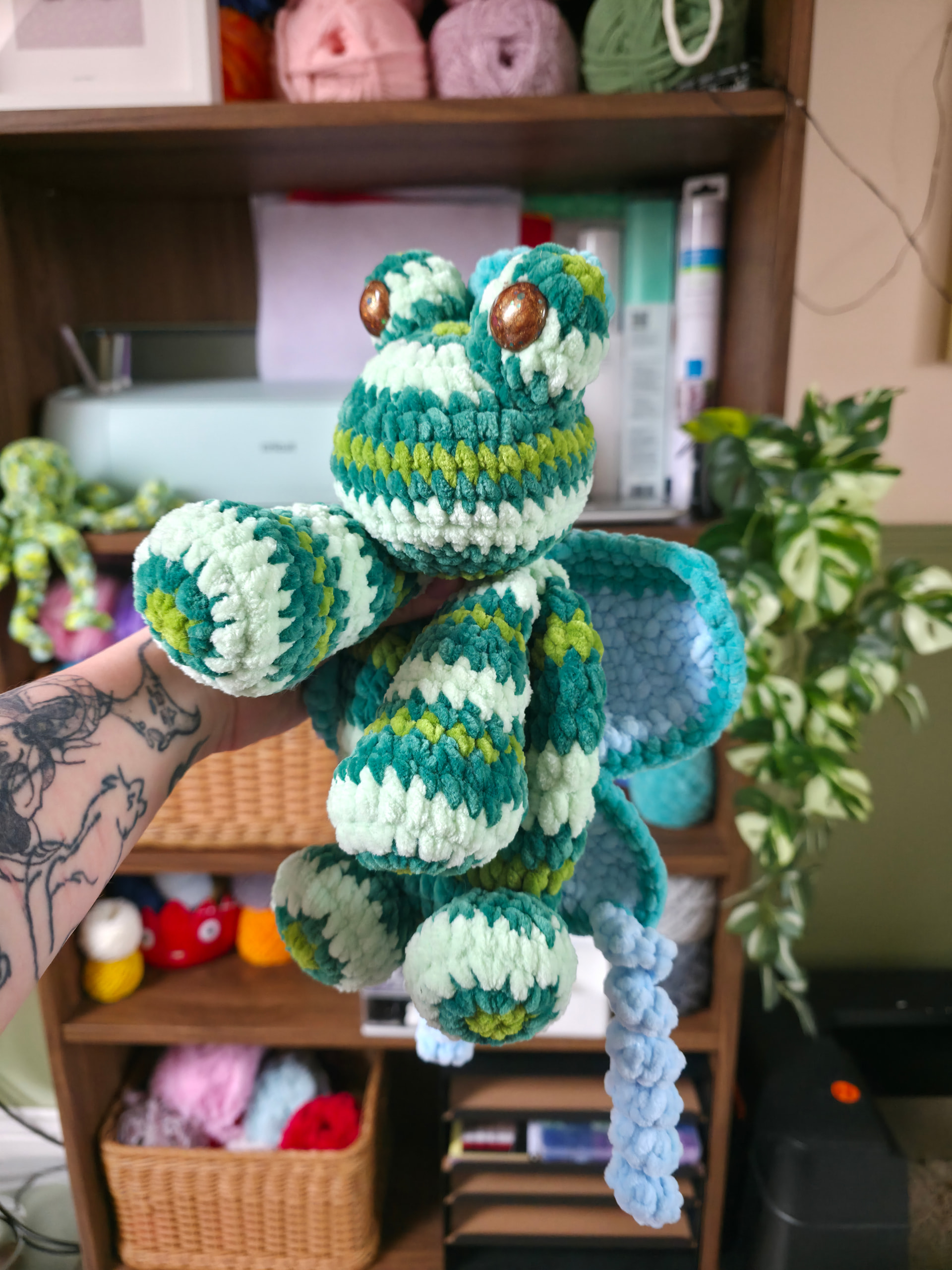 Oh my…IDK color scheme yet, but I have so much yarn to choose from. Sky frog…thinking blues and grays or white and yellow…might throw in a variagated yarn …oh, just got an amazing idea…sunrise or sunset colors based on a variagated color, gonna check my stash as I know I have an unused skein of cotton that would be perfect for this.