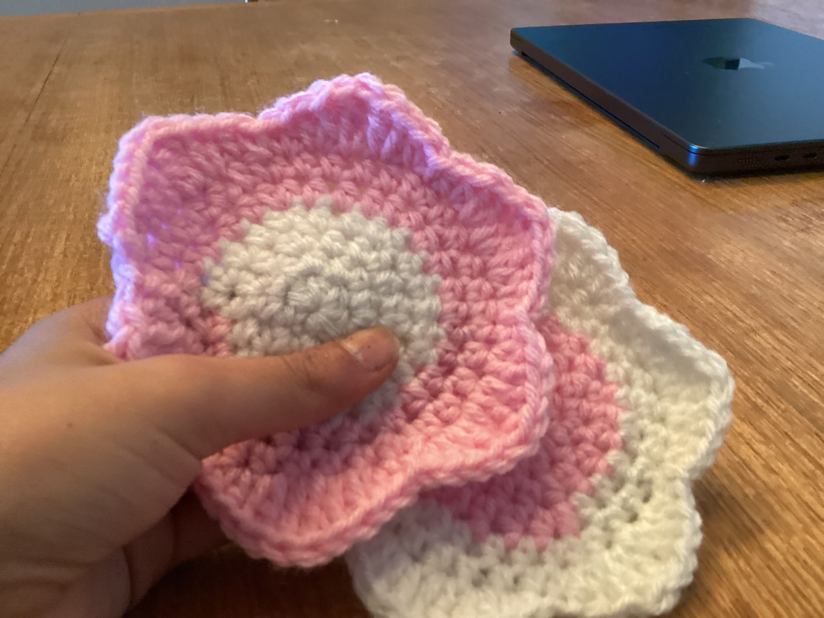 I was making a Christmas gift for my family and I was looking at inspo photos of flower coasters and I found this cute flower photo but I didn’t look at it after I just freehanded it and now I made a pattern for my version and idk if it’s copying since it is not the exact pattern it just is the same idea here let me show you the inspo photo and my version