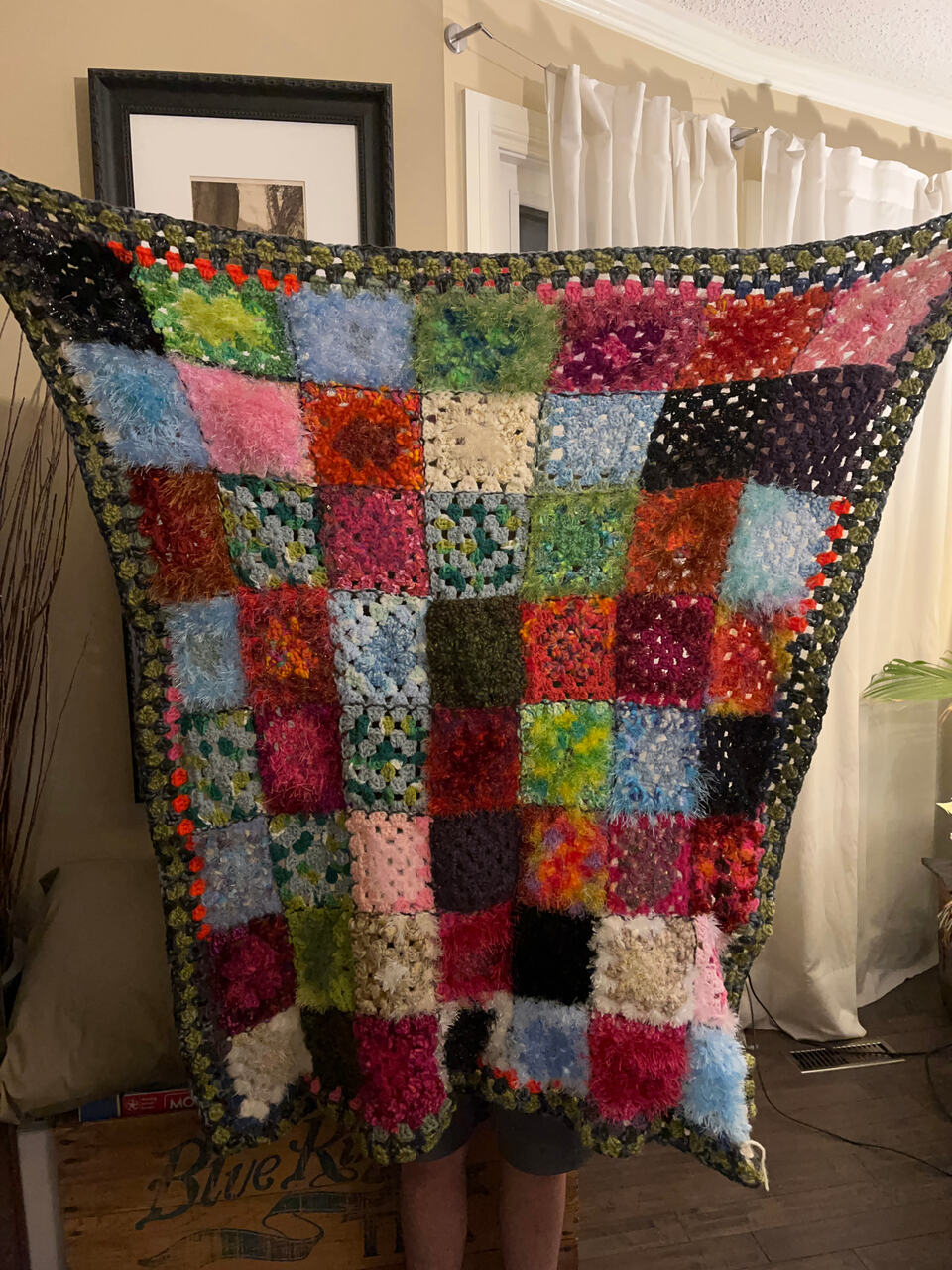 I’m really proud of a self-designed granny square blanket made with some super unique yarns. Most of the squares were made on a road trip, and the project kind of took over the entire trip. After finally joining them all together, it ended up being way smaller than expected, so I added a border and it still barely qualifies as a lap blanket. Still proud of it though.