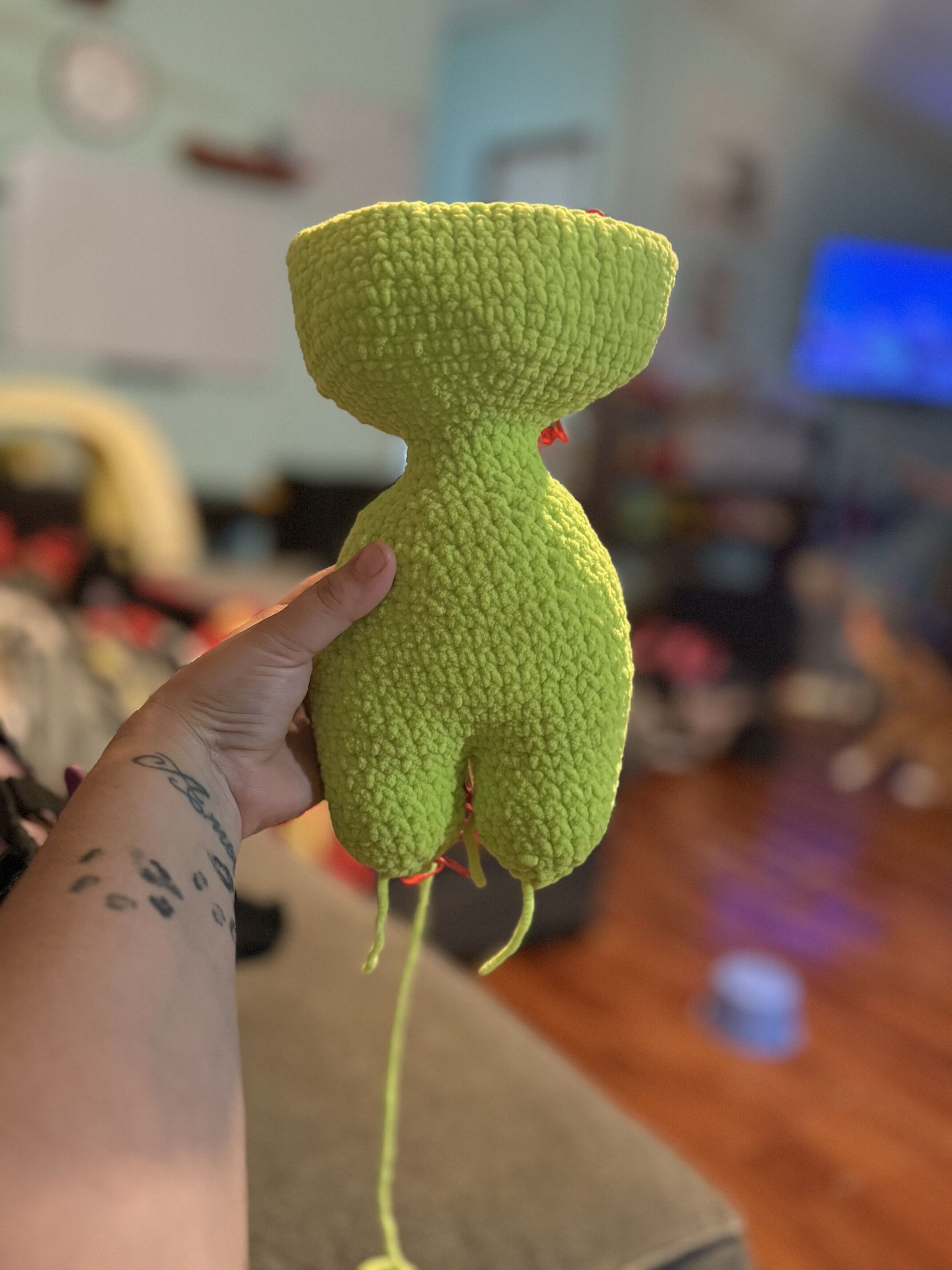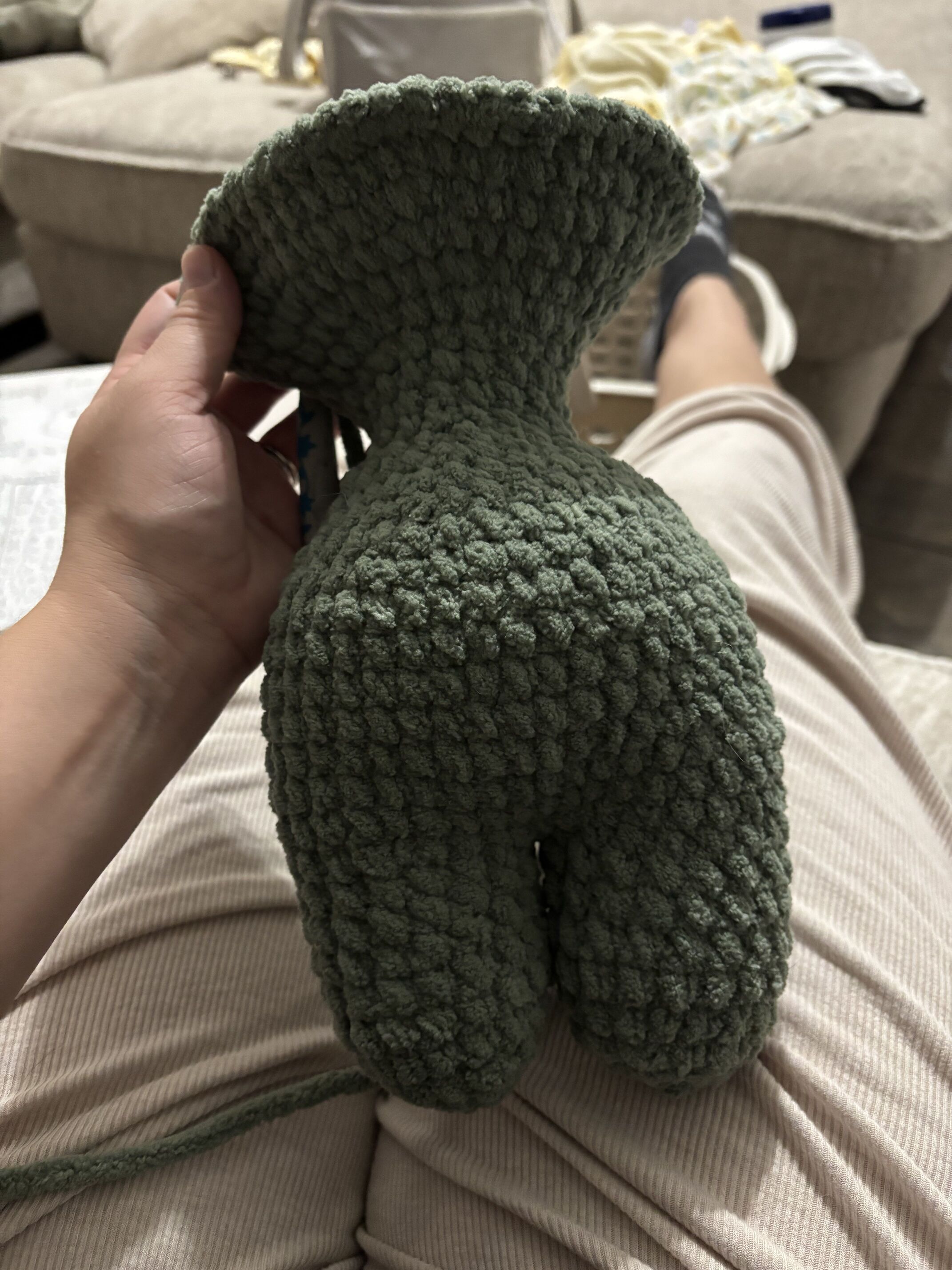 I’ve been out of the crochet game for a bit. I have some big twist stashed away and this green is perfect! My kids are going as lilo and stitch for Halloween and this will be perfect for my daughter. I’m planning on adding some temporary straps to it so she can kind of carry it like a Crossbody bag. Here’s my progress so far this morning. I’m gonna finish it up here in a little bit.