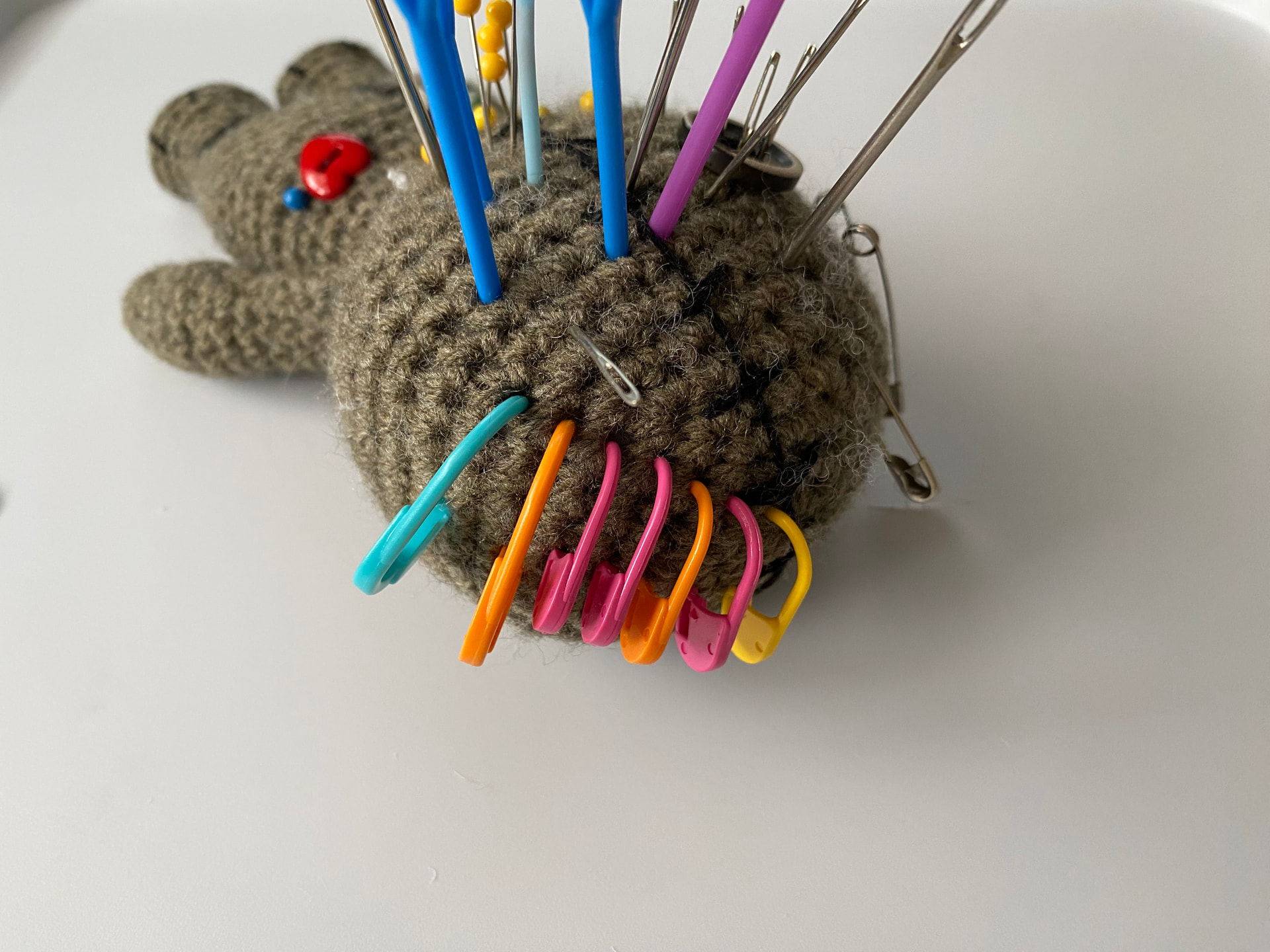 I use an amigurumi voodoo doll I made years ago to keep all my pins, needles and stitch markers. It’s always close by when I’m working. ![]()