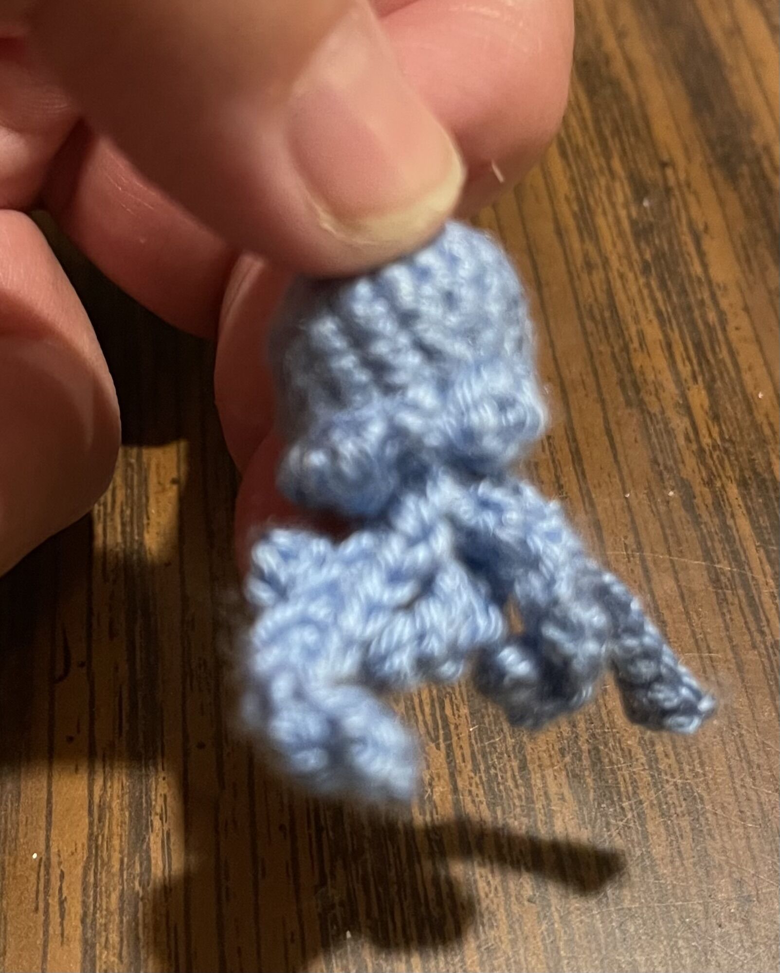 So my second oldest kiddo (she’s in her 20’s) asked for a jellyfish as small as I can crochet. I found a really thin yarn. I used a 2mm hook. I can’t actually see when I crochet anyways but the tiny hook is very sharp and pointy, so I stabbed myself a lot while making this. I’m not sure how many more I’ll make, but I had an idea for the future to make her a jar of jellyfish with a color shifting led candle in it. But anyways, behold the tiny! It’s like two strands of embroidery thread twisted together.