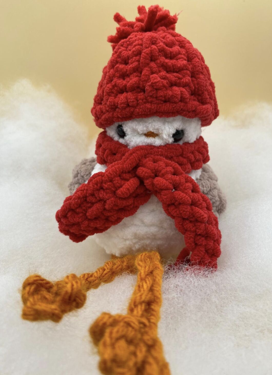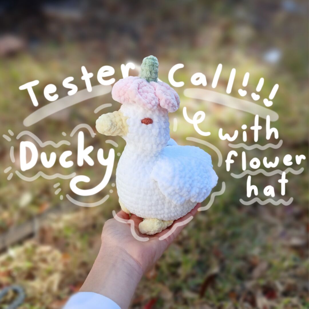 THIS IS SO FREAKIN ADORABLE SIABAUDHSJAK *ahem* anyways, I would LOVE to test this for you ! I would use parfait chunky in white, and them the sunshine color for the beak and feet, and also a light purple and light green for the hat . I would either use a 4mm or a 4.5 mm hook but probably a 4.5 mm I like tighter stitches. Anyways, again, ITS SO FRIGGIN CUTE I COULD DIE I MEAN EXPLODE EHWIANSJAK