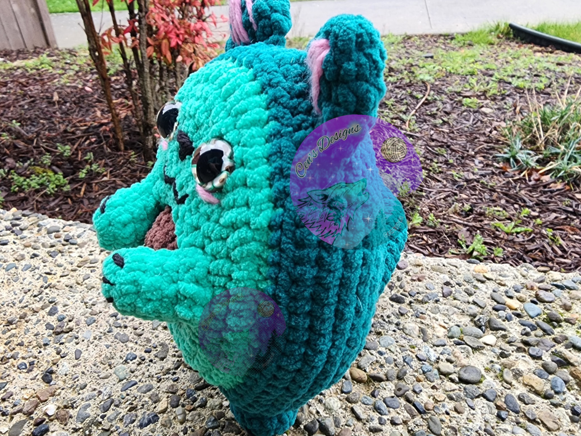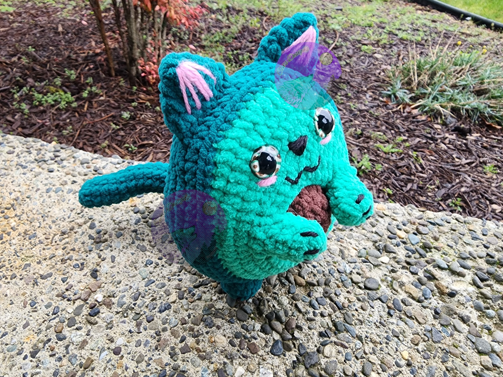 This is a confident beginner/intermediate pattern. There are some linked stitches involved here and optional wire in the tail so it stands on its own. Everything is sewn on but the ears. The pit is removable as a little stress ball, or you can reduce the size of the hole and sew it in place if you want it to be more pronounced (it can start to look preggo though )