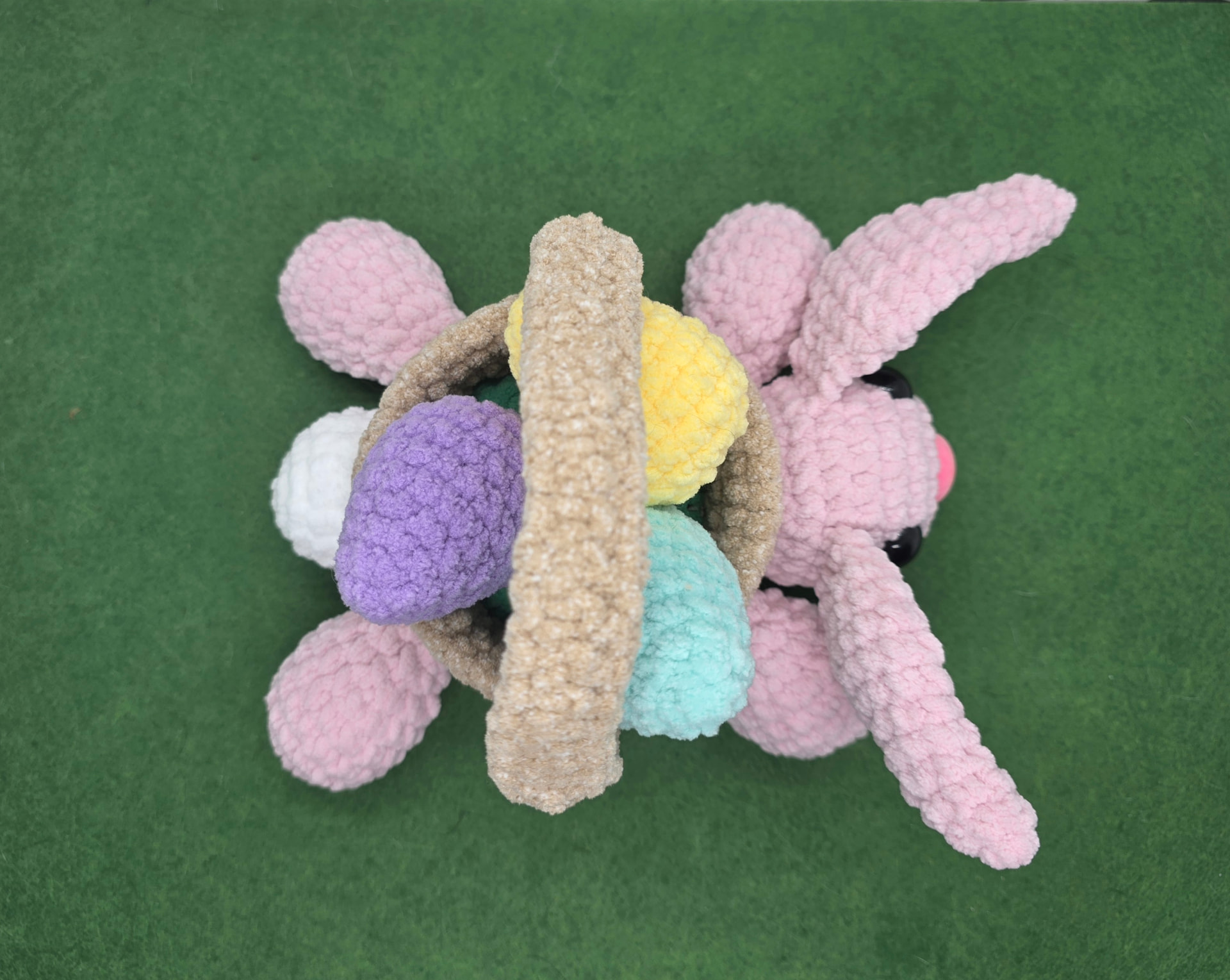 This project requires minimal sewing (head, tail (option for pom pom), basket handle). Only basic stitches utilized. Basket is in joined rounds (but would be fine in continuous rounds too!) with eggs and bunny in continuous rounds.