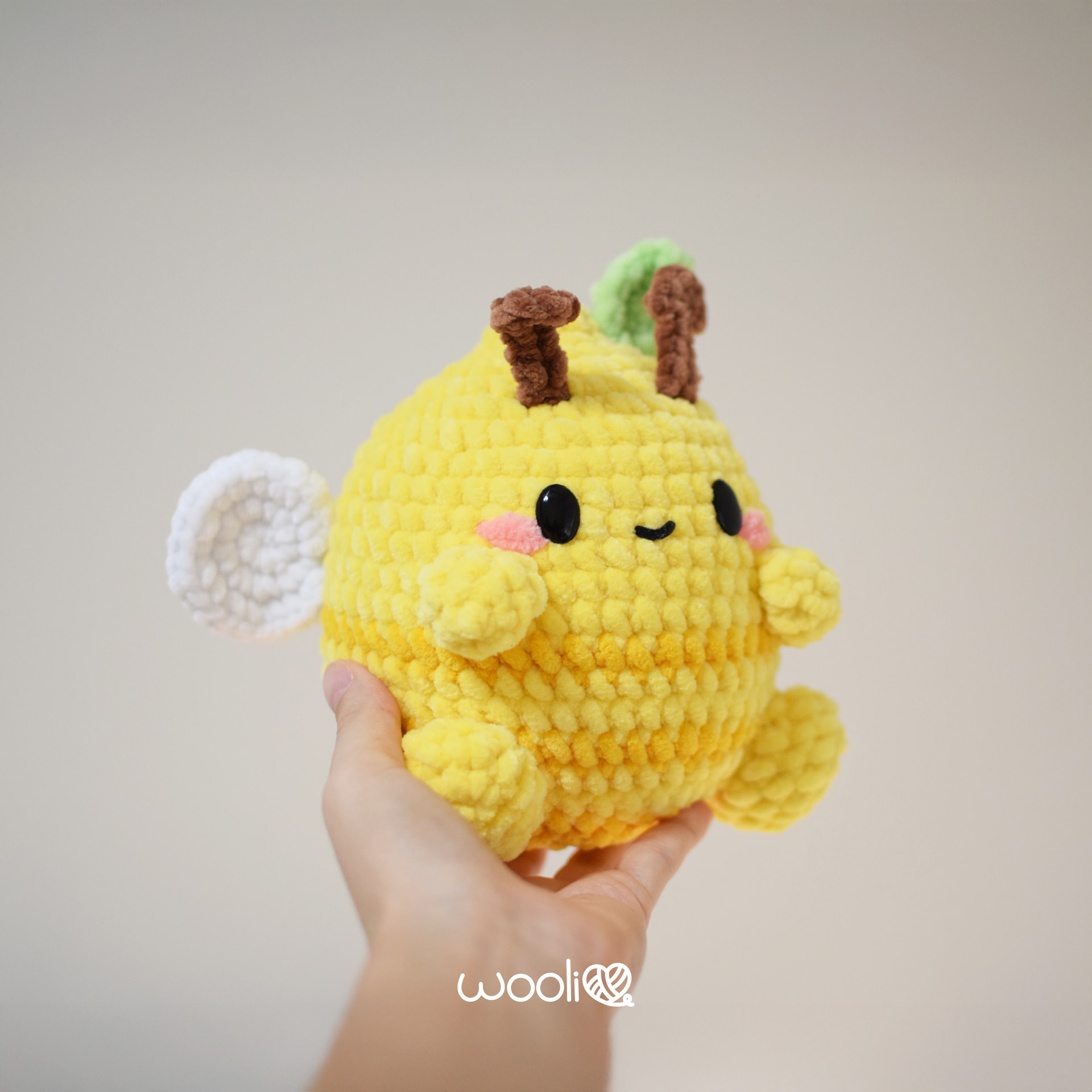 This is so cute! I would love to test with acrylic yarn in yellow for the body, brown for the antennae, green for the leaf, darker yellow for the stripes, and white for the wings. I would so it all with a 4mm hook!