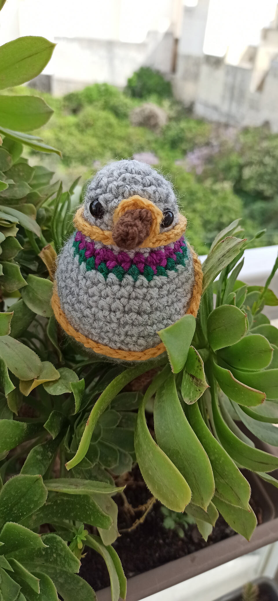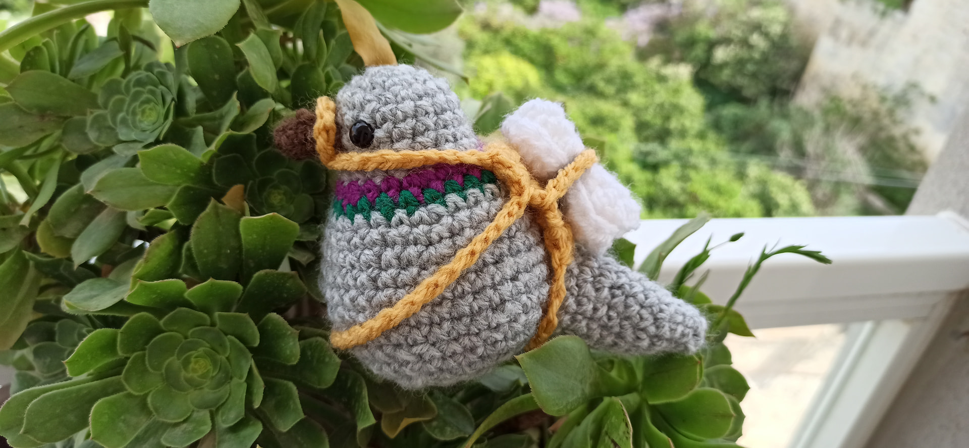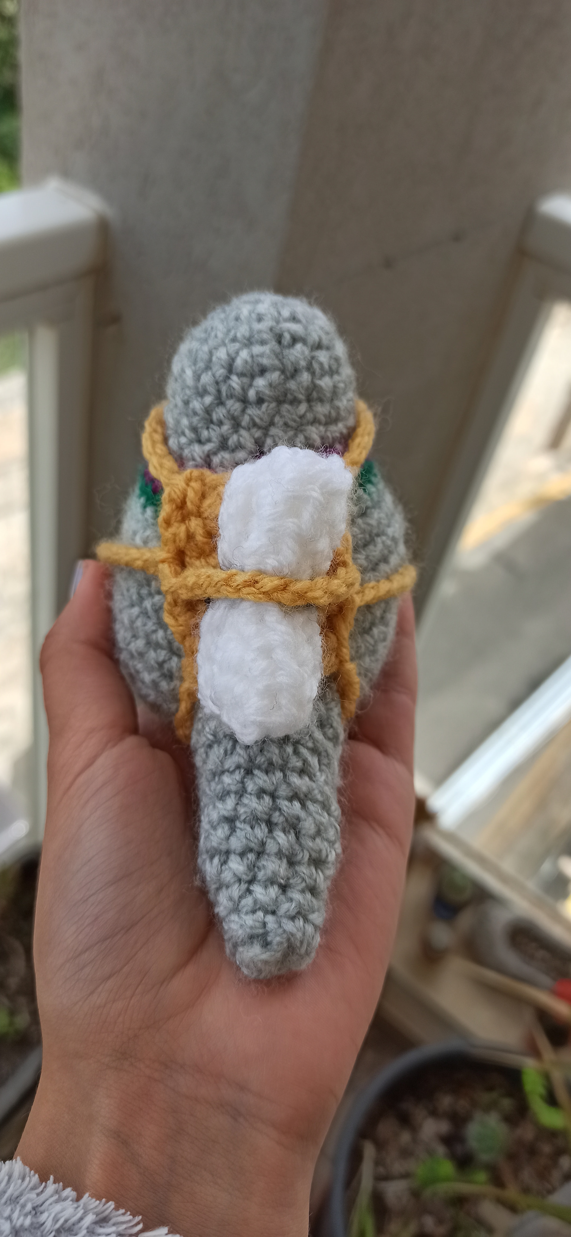 I can use a 3.5mm hook and acrylic yarn in grey, purple, green, brown, white, and maybe orange for the beak?