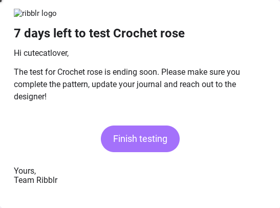 So I got a email from ribblr saying I have 7 days left to finish testing this crochet rose, but I don’t know what that is and it’s not in my testing tab. Then, I clicked on the finish testing button but it just led me to my patterns. Can anyone help me?