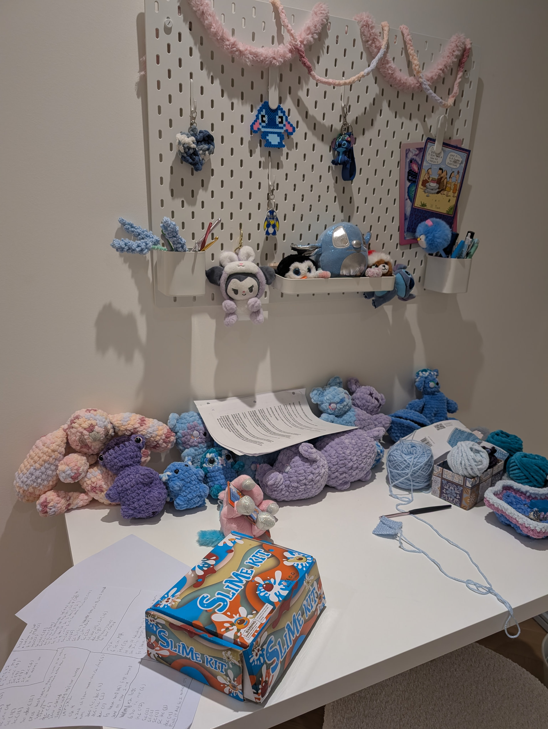 like there is homework written patterns yarn fluff and amigirumi projects everywhere (don’t mind the slime I’m addicted)my yarn winder like I don’t know where to put my amigirumi cause I feel bad putting it away ![]()