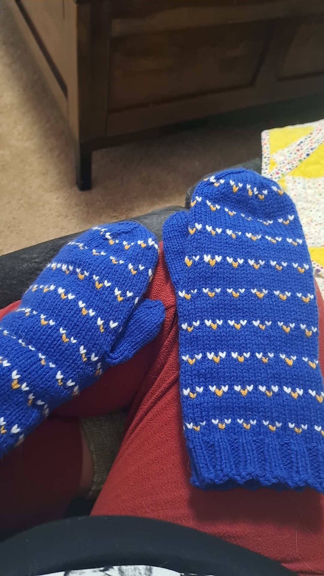 I’ve been all about crochet on here, but I started knitting again and this is the back panel for my cardigan. Harry Potter themed because I’m a little obsessed…but also because I have a HP pattern book. I used the chart from one of the mitten patterns and used it to add some pizzazz to my cardigan. I have forgotten how much I enjoy following a chart in colour block knitting.