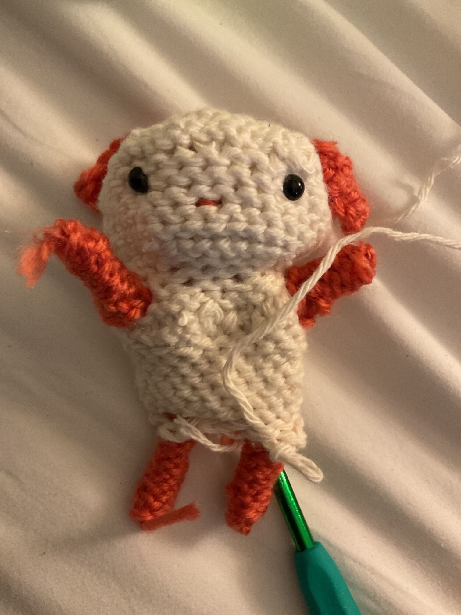 I made this thing that was supposed to be a cow butit didn’t look right so a turned it into a dog then my sister called it an axolotl but not it just looksclke an alien???