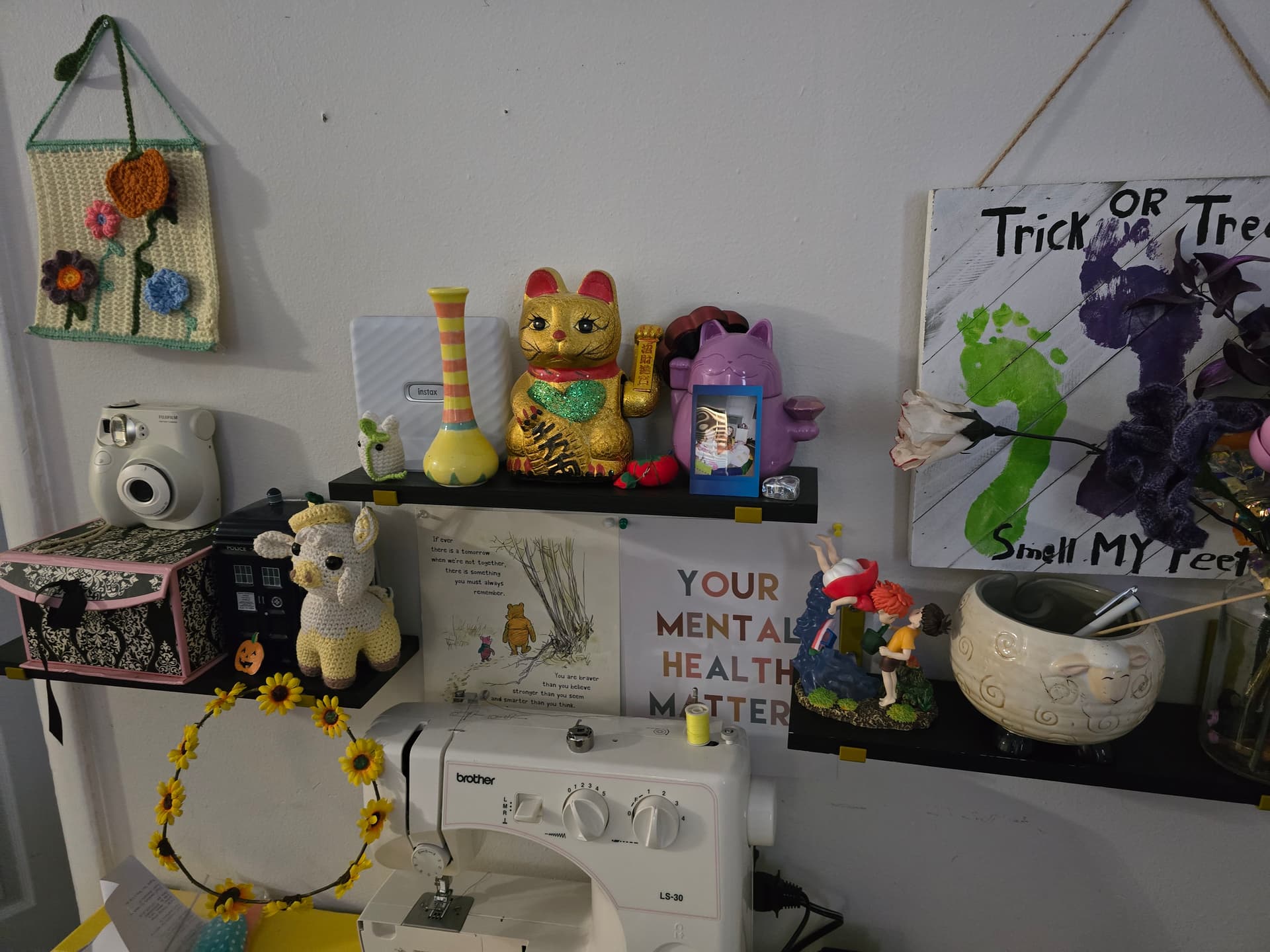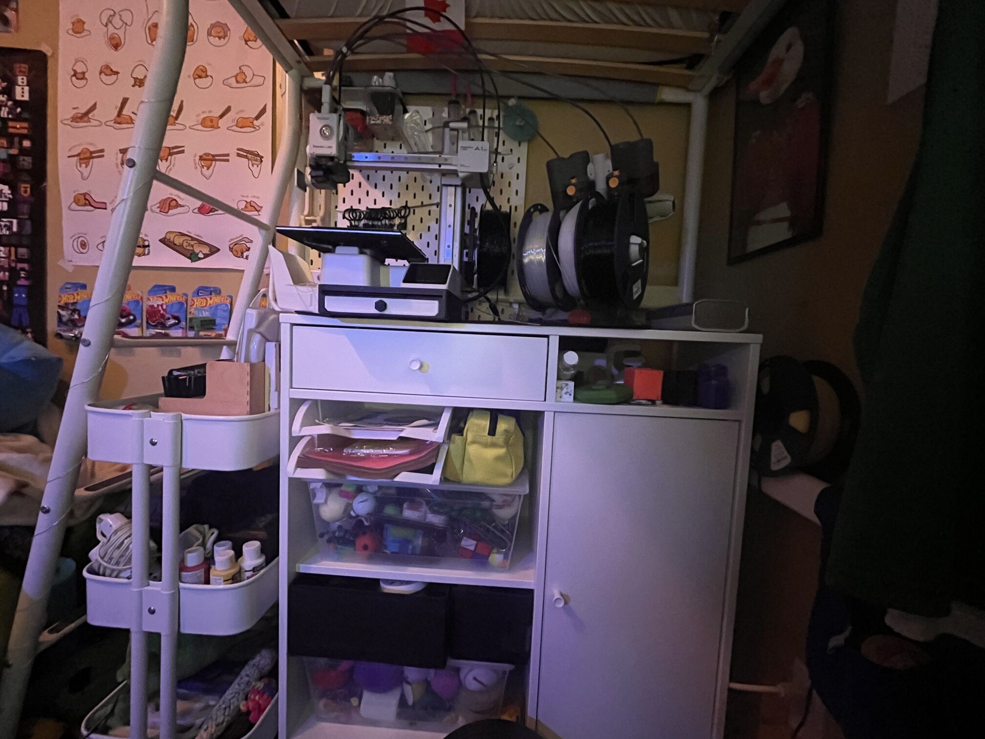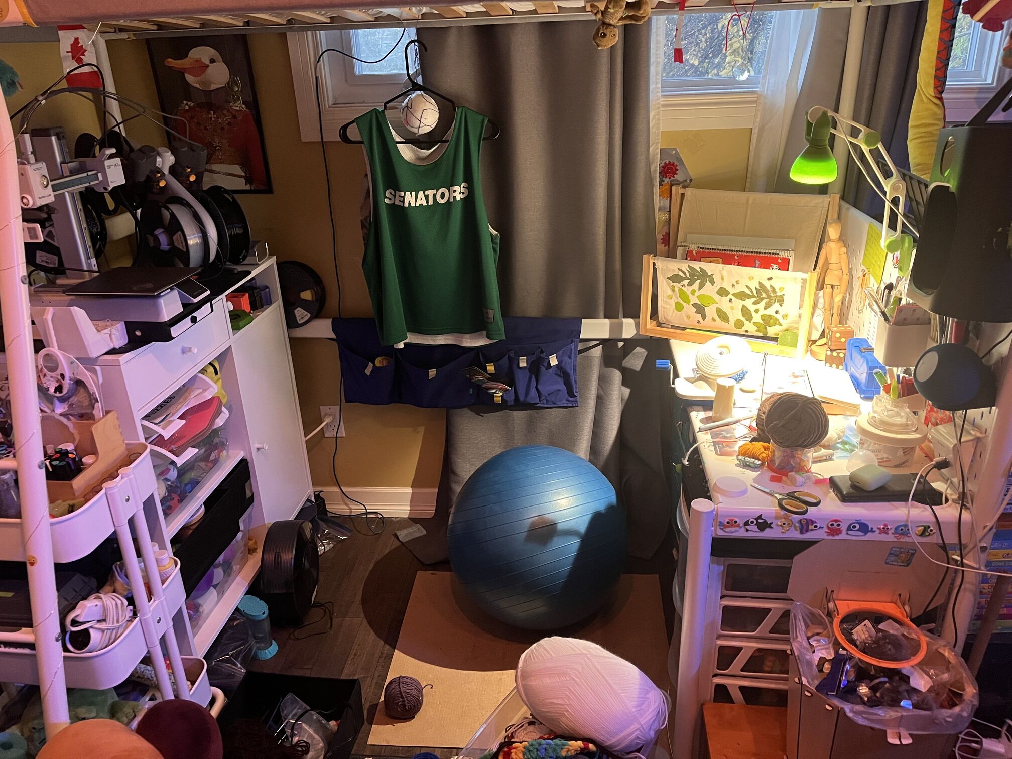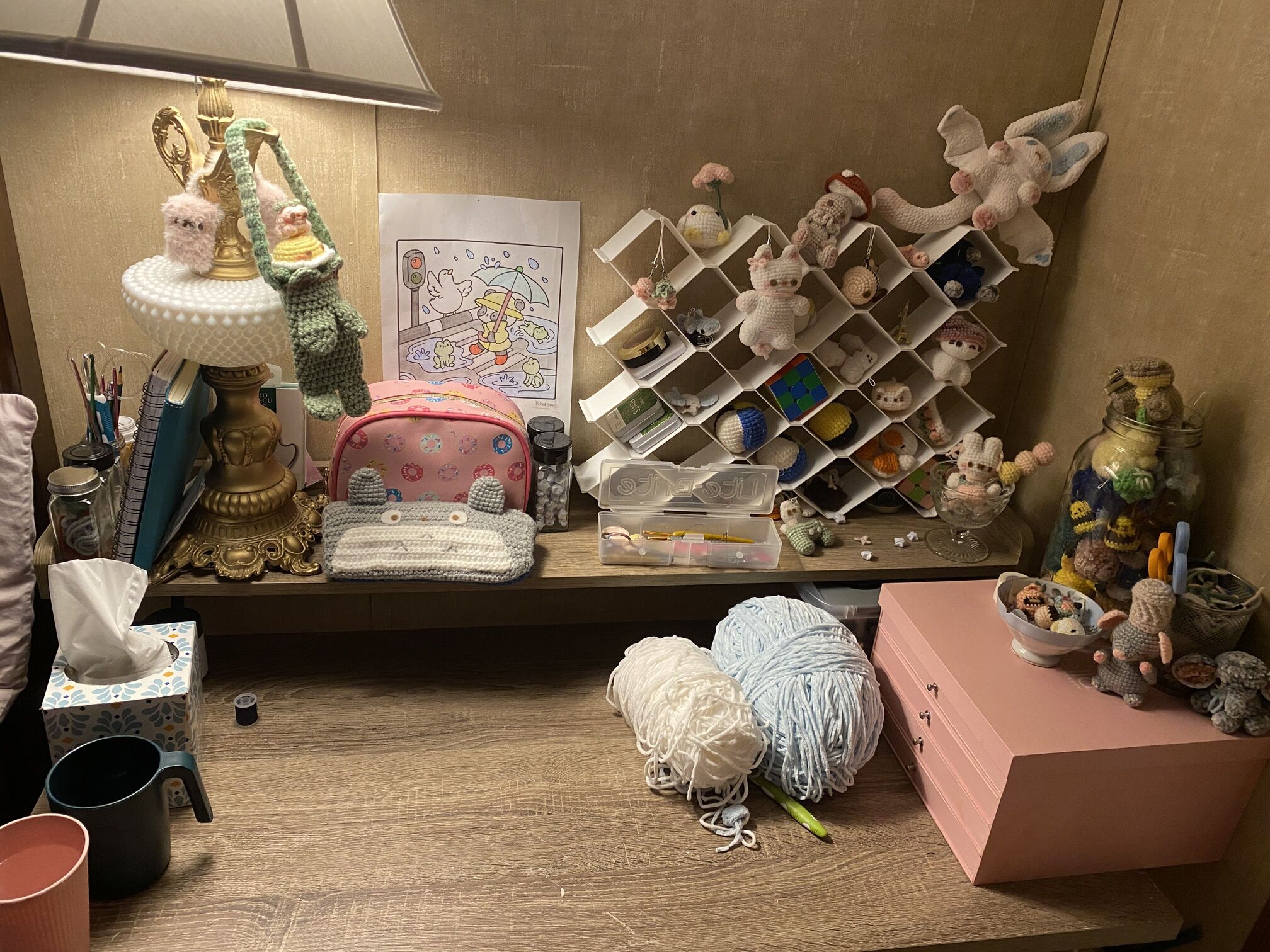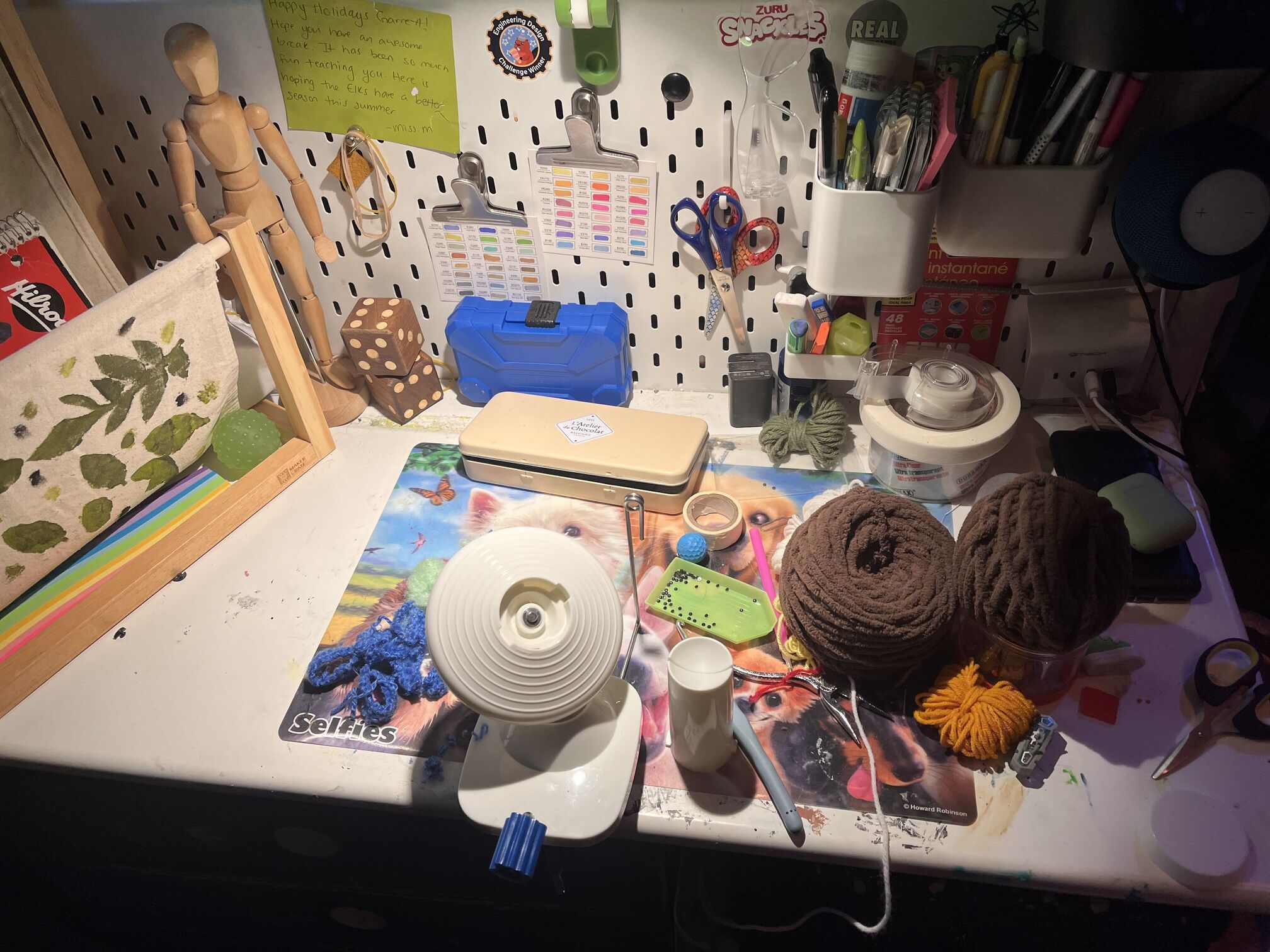 It’s my desk/workspace area. Rn it’s a makeshift yarn winding laboratory. Also a bit of storage. Not the messiest it’s ever been?