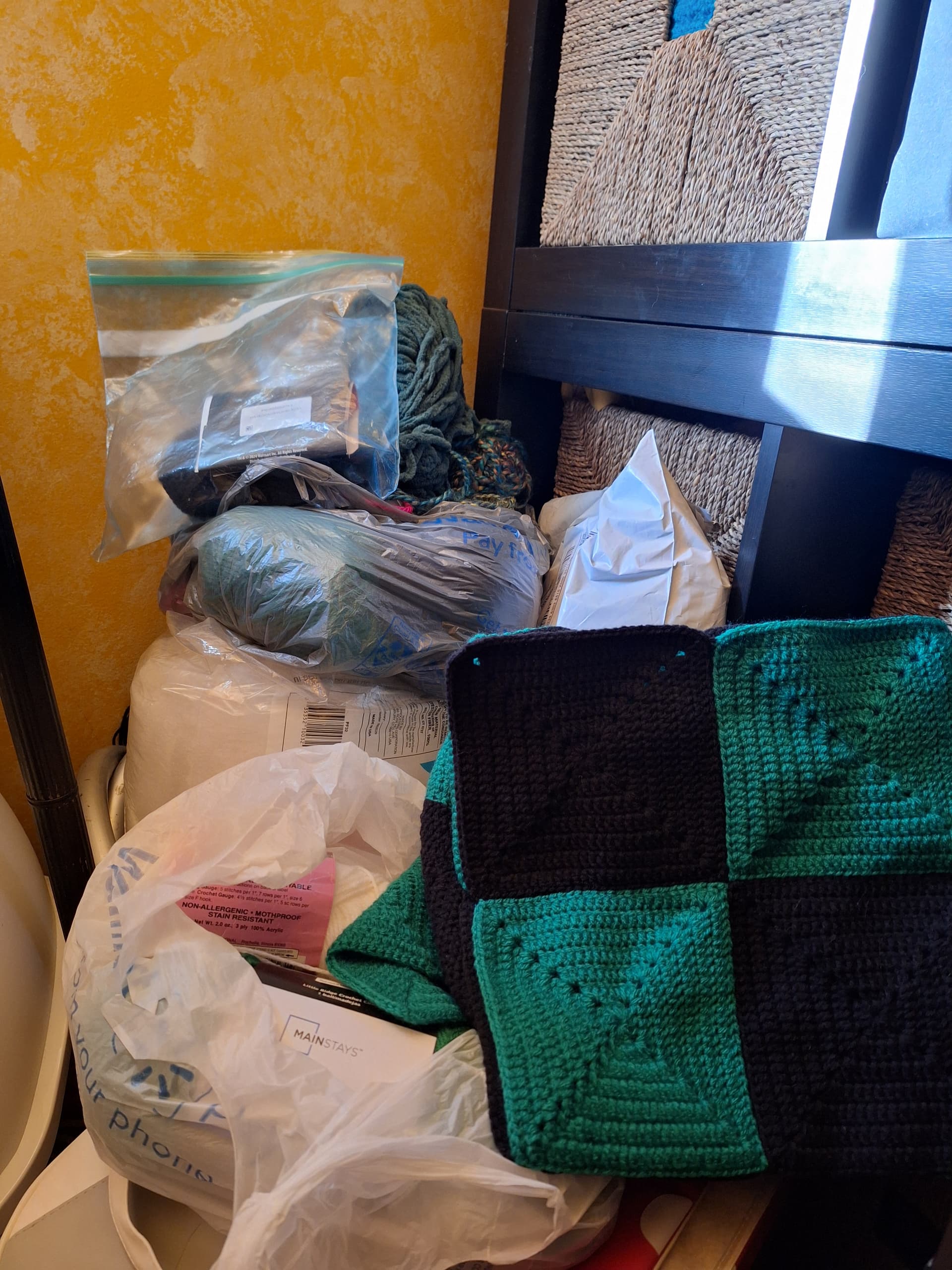 I am a crochet nomad. There is yarn all over the house. The basement, the living room, the hallway, my bedroom, and the guest bedroom