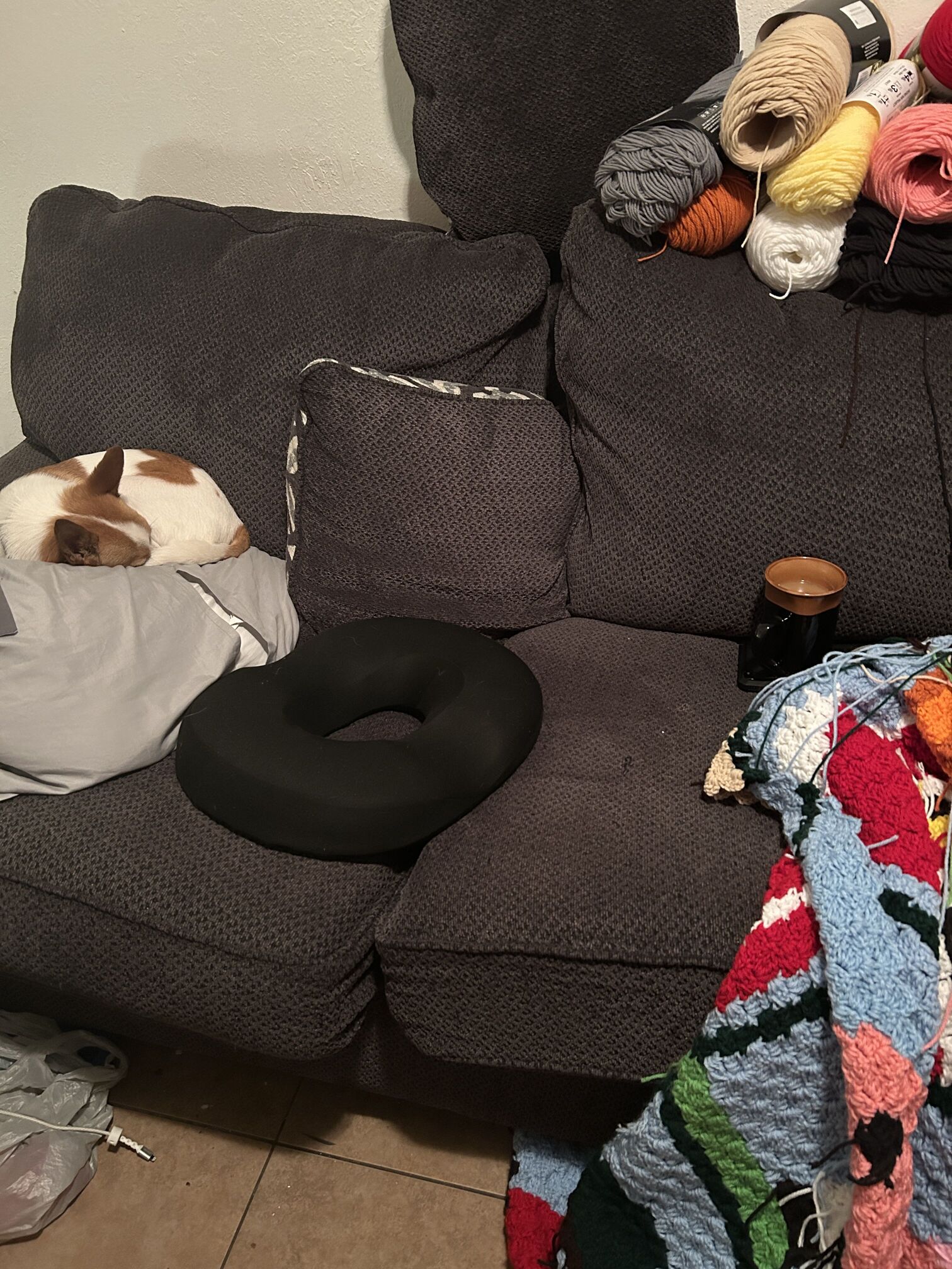 I mostly crochet on the couch or in my bed and bring a bag with my materials for the project I’m currently attempting to finish.