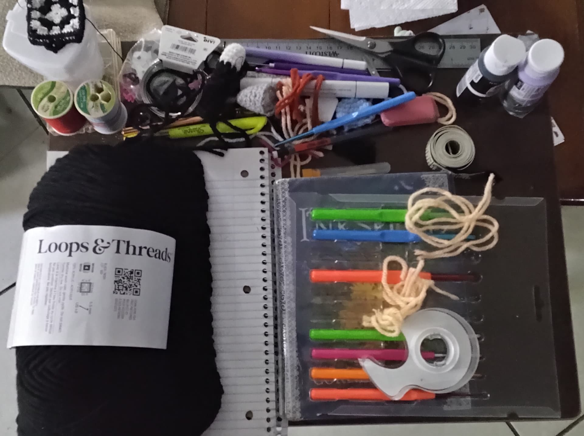 Yarn attached to a wip, lots of hooks, an empty tape roll, a book, paint, thread, crochet earrings, a tape measure, scissors, paint, wire, pens, pecils, and markers, cast off bits that didn’t work, and so much more…