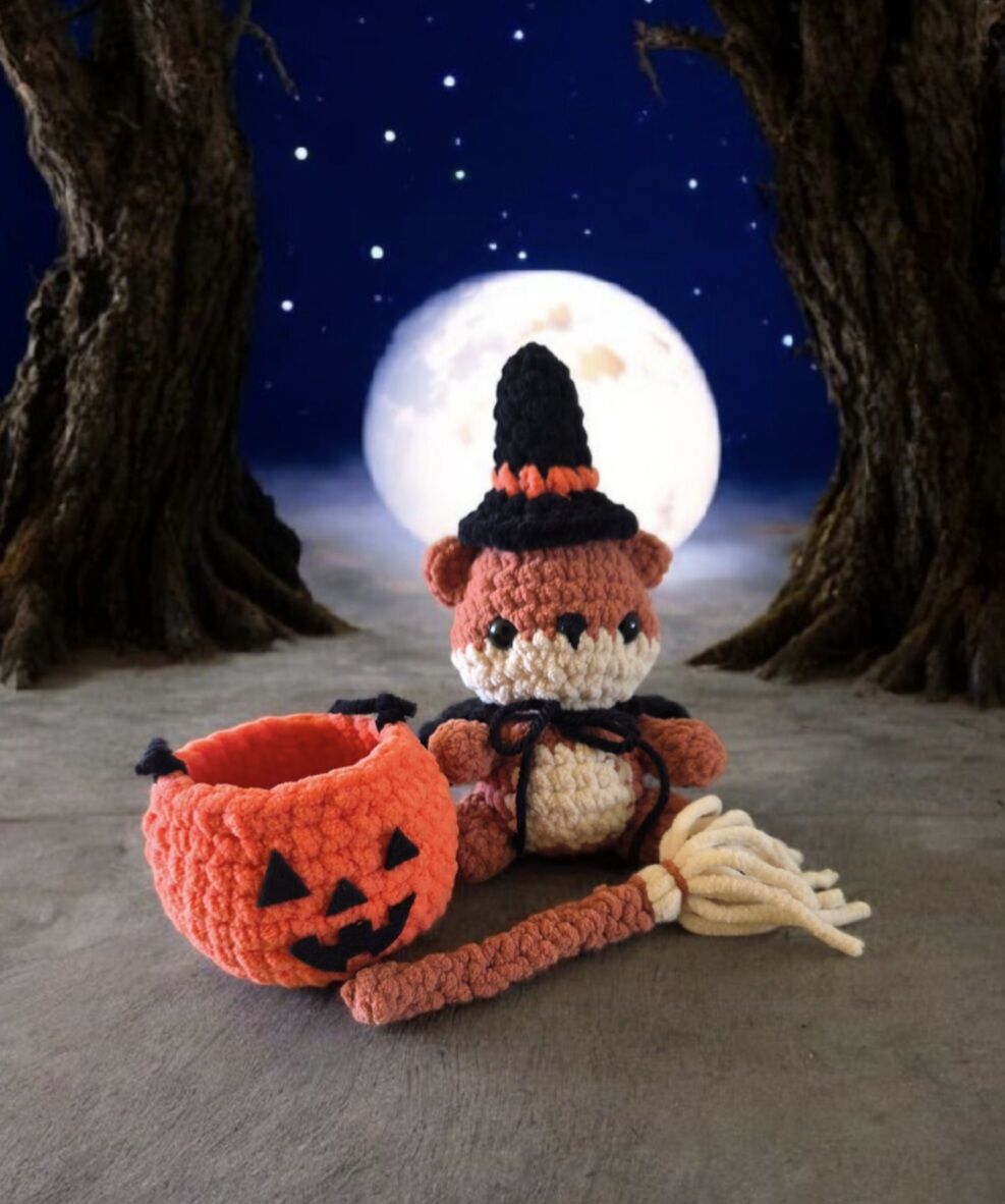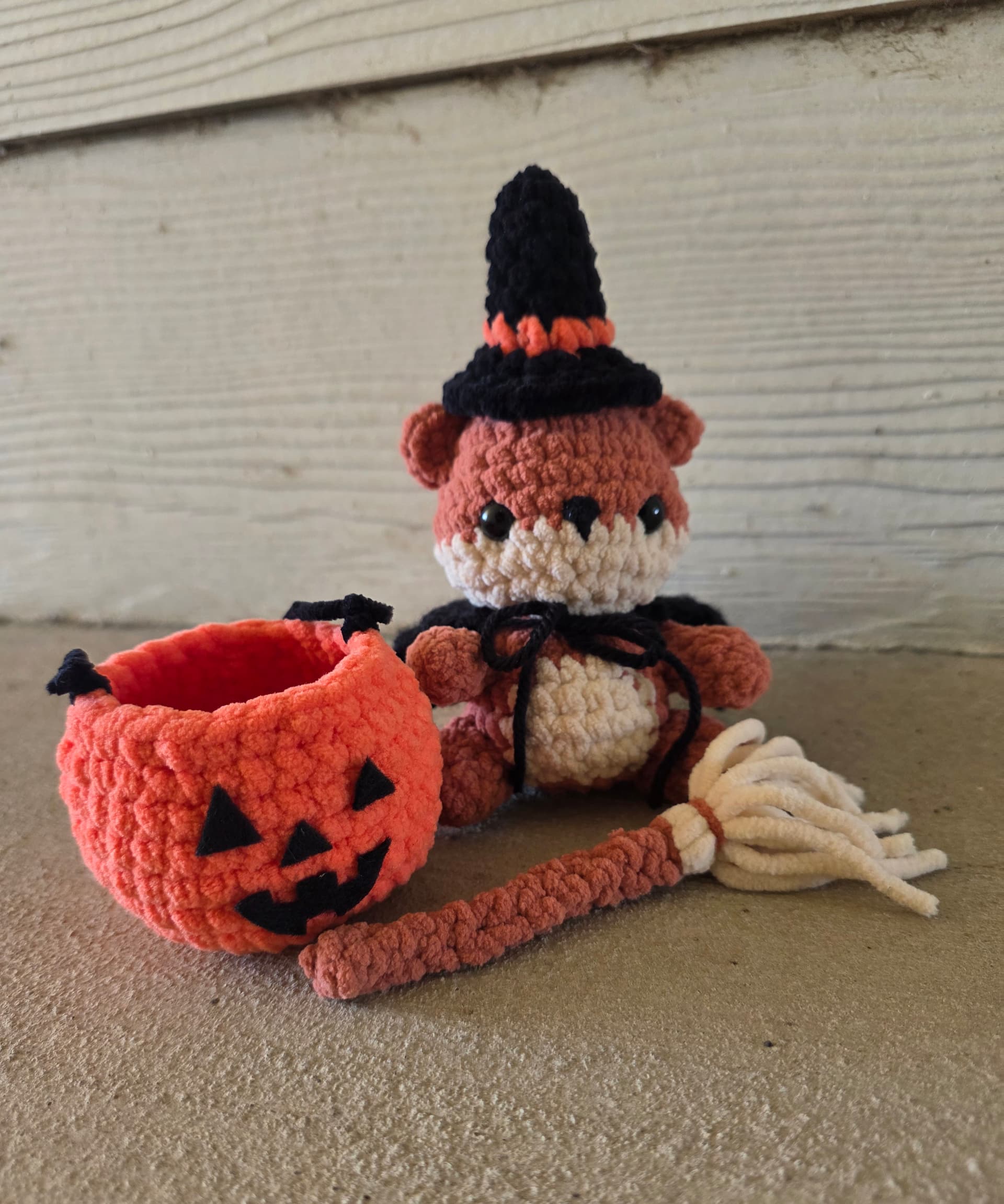 Made her a free-handed crocheted witch costume (hat, cape, broom) with her own candy bucket for trick or treating today!